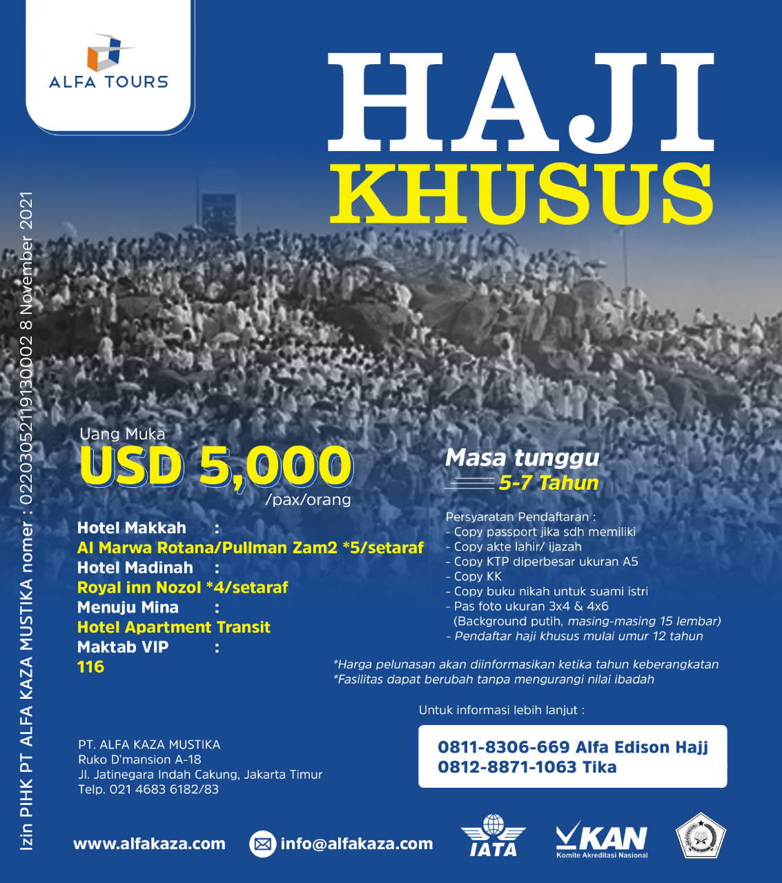 PT. Alfa Kaza Mustika (ALFA TOURS) merupakan salah satu Penyelenggara Perjalanan Ibadah Haji Khusus (PIHK) terbaik di Indonesia yang siap dan memiliki pengalaman memberangkatkan para Jemaah Haji dan melayani jutaaan Jemaah Haji Indonesia.